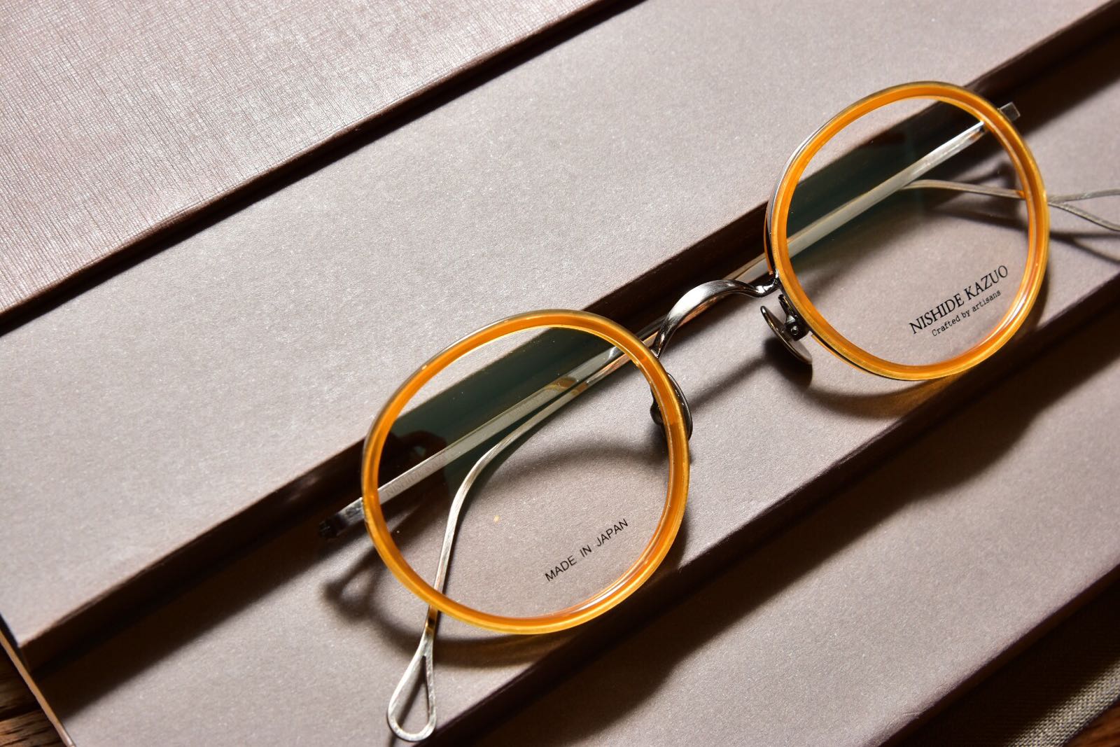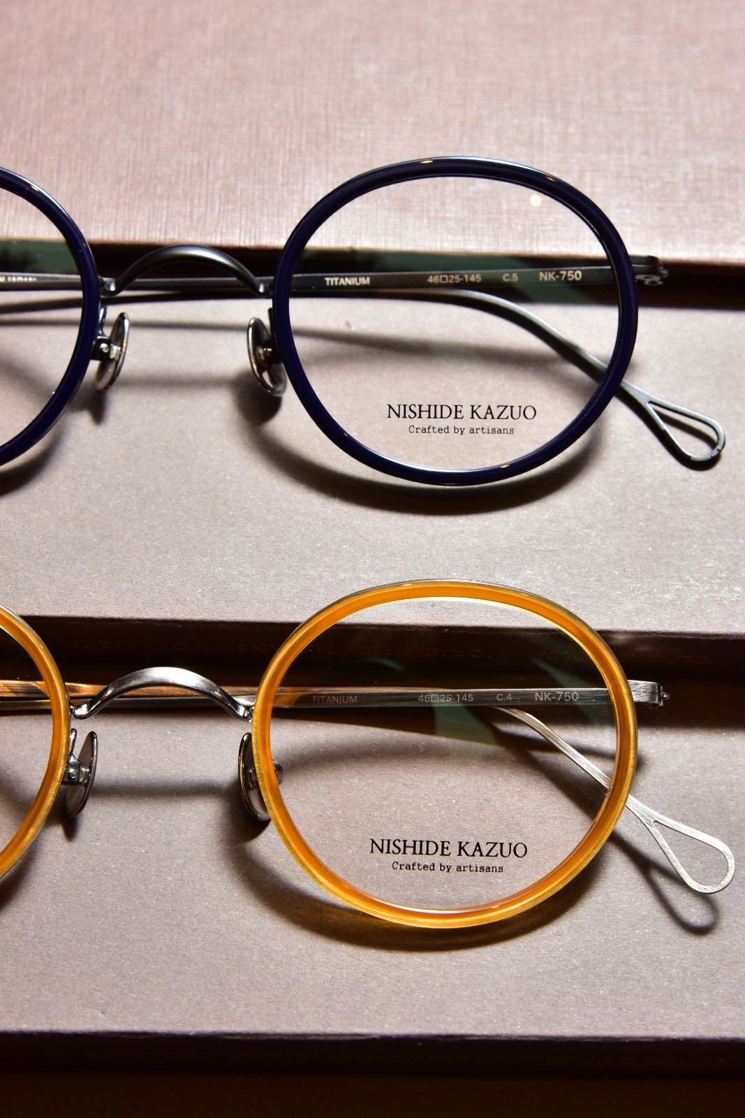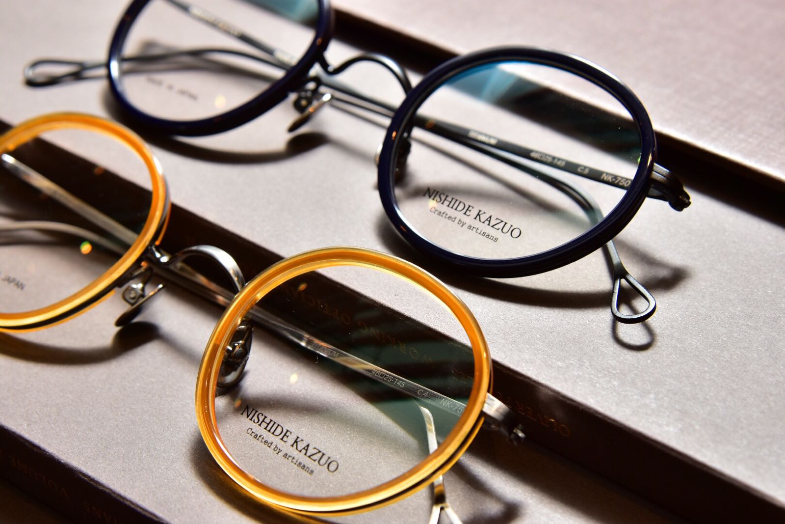 日本國寶級職人需擔負起重任,基本上一副鏡框的成敗在於職人的造化,而擁有40年製作經驗的西出和男無論在選材、切割到打磨拋光等,都充分展現出其爐火純清的功架。一向以細膩造工見稱的西出和男作明白到技術固然之重要,但與時俱進的時代感卻缺一不可,因此在作品中就加插了很多流行元素,例如配色及素材的搭配,感覺煥然一新。在型號NK-750中大家清晰可見板材和金屬的完美結合,兩者沒有半點瑕疵,和諧一致。此外鏡型的規劃同樣重要,鵝蛋形的設定特別適合亞洲人的面形輪廓,加上金屬組件的打磨效果反映出一種復古美感,屬於一款內外兼備的作品,值得加許。